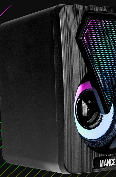 Com ângulos marcantes e linhas que combinam completamente com o mundo gamer, essa caixa de som entrega um design diferenciado juntamente com iluminação Rainbow que certamente se encaixará com o seu setup trazendo um visual bonito e moderno!